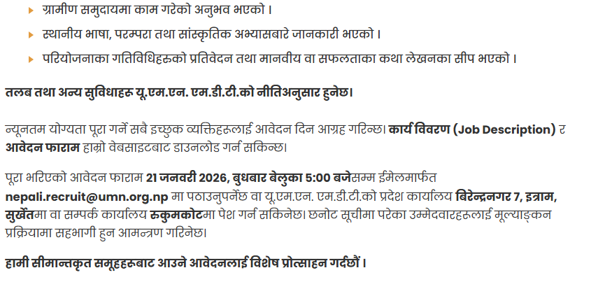 Social Mobiliser Full Time Surkhet, Rukum Posted 1 week ago Closes: January 21, 2026 Website UMN Medical and Development Trust Download Job Description Download Application Form To apply for this job please visit www.umn.org.np.